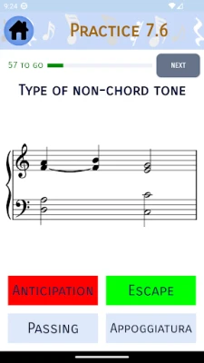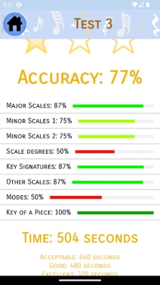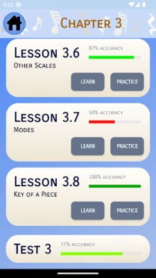 Po opanowaniu materiału, sekcja „Sprawdź" pozwoli Ci ocenić swoje zrozumienie każdego rozdziału za pomocą losowo wybranych pytań z poszczególnych lekcji. Każde pytanie pojawia się tylko raz, niezależnie od poprawności odpowiedzi. Po zakończeniu testu otrzymasz szczegółową analizę Twojej ogólnej dokładności, precyzji w każdej lekcji oraz czasu potrzebnego na jego ukończenie. Obszerny program nauczania obejmuje wszystko od podstaw (nuty, klucze, oktawy) przez rytm, skale, interwały i akordy, aż po harmonię, melodię, kontrapunkt, modulacje i zaawansowane ćwiczenia słuchowe, gwarantując kompleksowe przygotowanie.